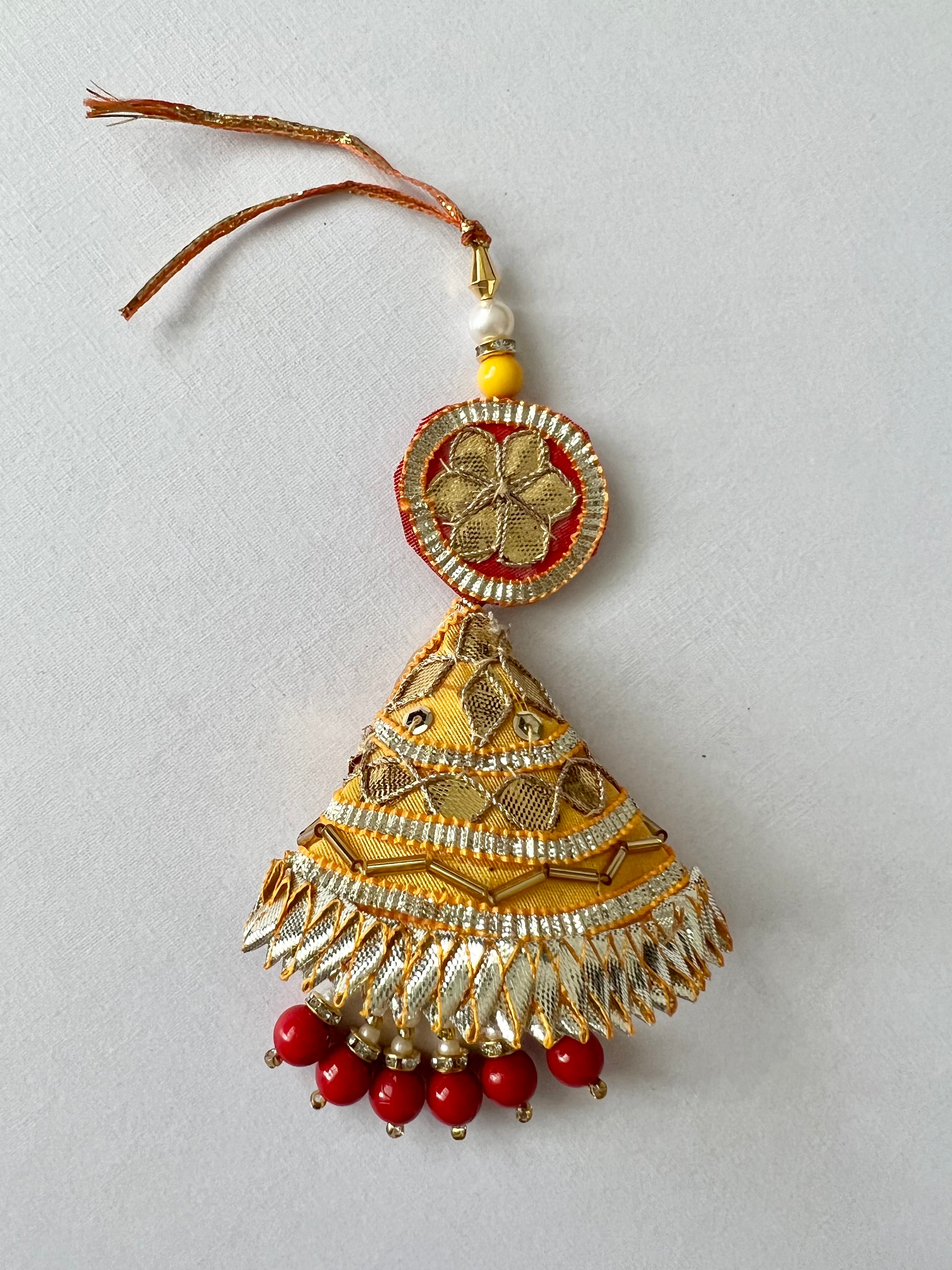 A promise to love and to protect is sealed by the special thread of Rakhi. This Raksha Bandhan express your love for your Brother and Sister in Law / Bhabhi with our beautiful , exquisite , handmade with lots of love Gota Patti Rakhi and Lumba Set. Lumba stands for a Bangle and its traditionally a custom which traces it roots to the state of Rajasthan especially the Marwari Clan . In today's modern age , the tradition of tying a lumba is practised across the country with festive zest and fervour . On Raksha Bandhan , a sister ties a Lumba Rakhi on their Sister-in-Law's Bangle or wrist . It's a token of love and respect towards the Bhabhi along with wishing her good health and a happy married life . It also is symbolic of an everlasting relationship of friendship between a Sister and Sister in Law. Post the festival , instead of adding to the landfill as waste the rakhi and lumba can be reused as a brooch or a fridge magnet , or as a tassel to your favourite dress or bag. This Raksha Bandhan celebrate and treasure the wonderful relationship between a brother and a sister and sister-in-law and cherish the keepsake rakhi , lumba and the memories with Little Canvas.